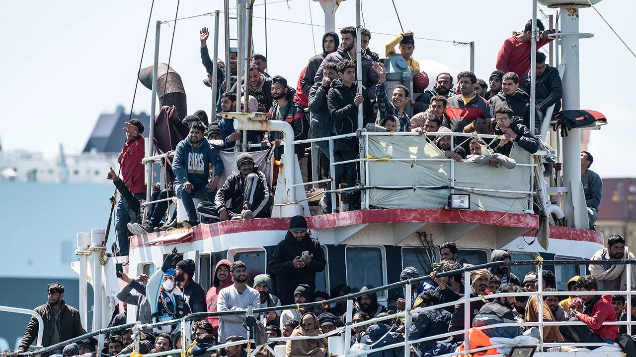 Migrantes en un barco pesquero llegan al puerto de Catania, Italia, en 2023. (Fabrizio Villa/Getty Images)
