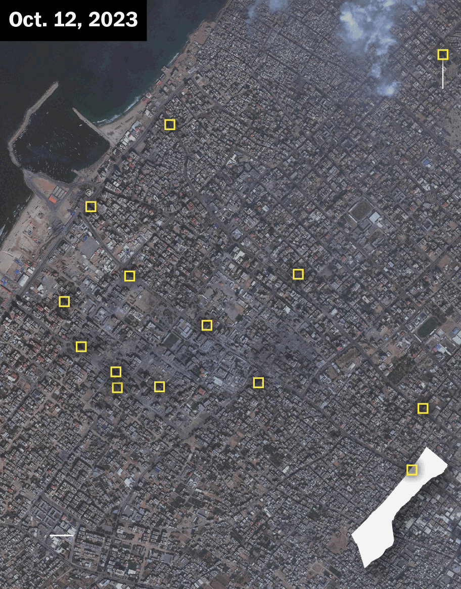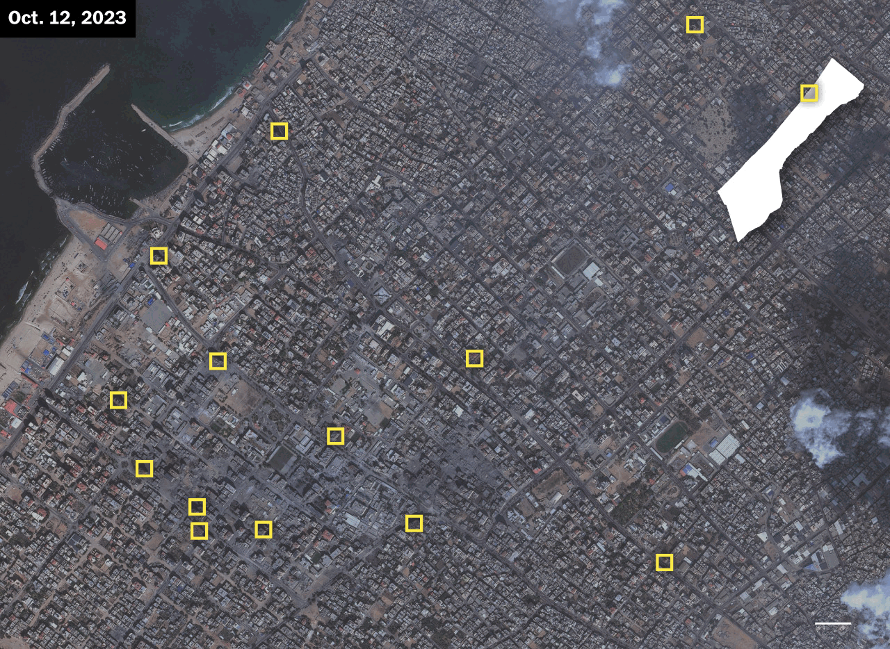Las imágenes de satélite muestran la destrucción que deja el bombardeo israelí, que deja los edificios y sus alrededores planos.