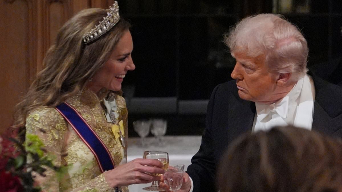 Kate estaba sentada a la derecha del Sr. Trump en el extraordinario banquete del estado del Castillo de Windsor anoche, compartiendo las gafas con él y sonriendo con él repetidamente.
