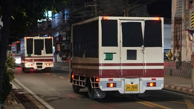 Se vieron camiones de cinta negra en las ventanas de las ventanas saliendo de un centro de detención el jueves 2 de febrero, Tailandia’s Bank. Tailandia exilió al menos cinco judíos en China. (AP/Nadafole Makeovon/AP a través de AP)