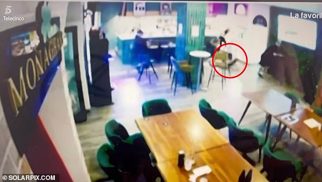 Las imágenes gráficas de Gangland Warfare se transmitieron ayer en la televisión española que demostró que estaba tropezando y vestida con escalones negros hacia Monhahan y se arrodilló frente a él.