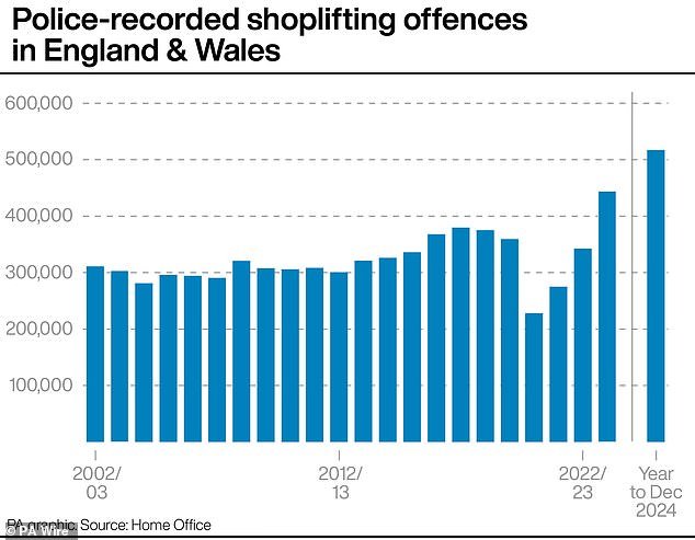 Por primera vez, el número de delitos de levantamiento de tiendas registrados en Inglaterra y Gales ha pasado medio millón, mostrando estadísticas.