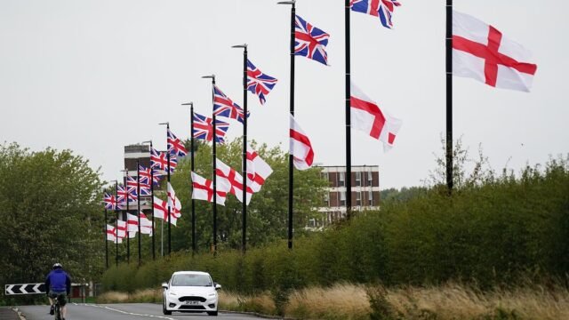 Un borrador filtrado de las propuestas sugería el verano pasado que los símbolos nacionales a veces se utilizaban para “excluir o intimidar”. Imagen: Banderas Union Jack y banderas de San Jorge cuelgan de farolas en Birmingham