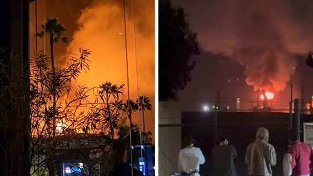 La explosión de la refinería de California convierte el cielo nocturno en la bola de fuego naranja, espectáculo de videos