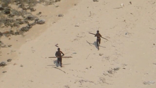 Esta rara fotografía tomada desde un helicóptero de la Guardia Costera de la India muestra a la tribu sentinelesa de la isla Sentinel del Norte en las islas Andaman y Nicobar.