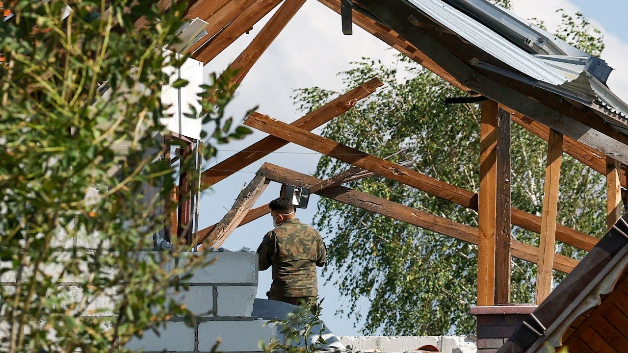 Un miembro del ejército de Polonia visitó una casa dañada en Waireki en Lublin Vovodaship, Polonia, después de que los drones rusos violaron el espacio aéreo polaco durante el ataque del 10 de septiembre de 2025. (Quaker Pampel/Reuters)
