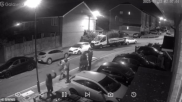 Las imágenes impactantes de CCTV mostraron que un grupo de ocho personas caminaba hacia su casa antes de lanzar ladrillos para romper sus ventanas.