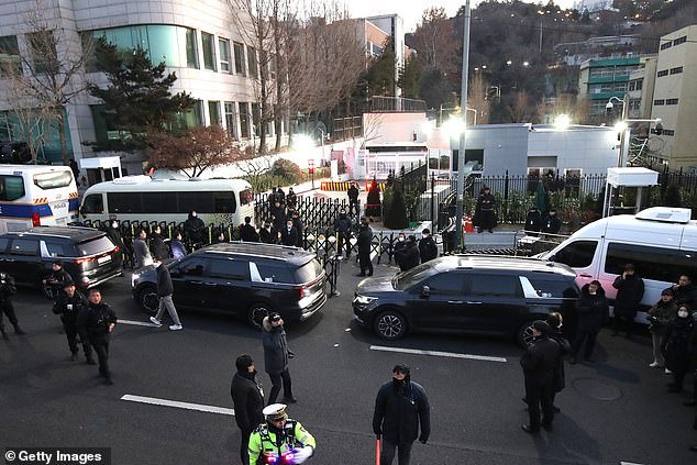 Los vehículos de la Oficina de Investigación de la Corrupción para funcionarios de alto rango llegan frente a la residencia oficial del presidente surcoreano acusado, Yun Suk-yeol.