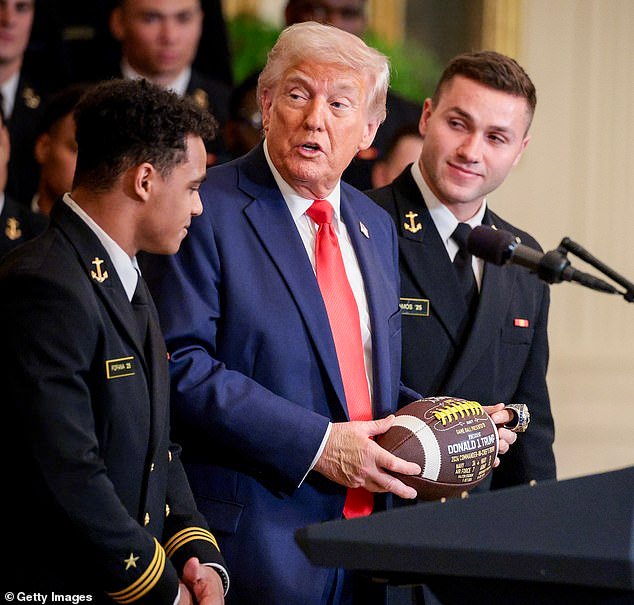 La extensa lesión fue claramente visible el martes para presentar el Trofeo del Comandante en Jefe de Trump al equipo de fútbol de la Marina Midshipman el martes.
