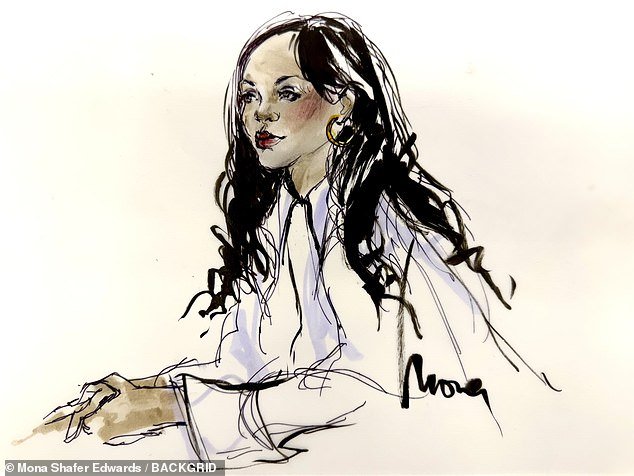 Los bocetos de la corte indican TMZ Informó que donó una ‘parte superior blanca abotonada, corbata negra delgada, pantalones de trabajo negro y bombas de punto negro’.