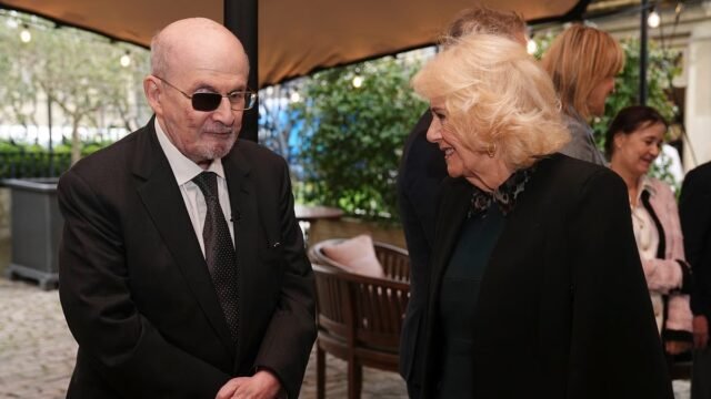 Queen conversó con el autor británico-indio Sir Salman Rushdie (en la imagen de la izquierda)