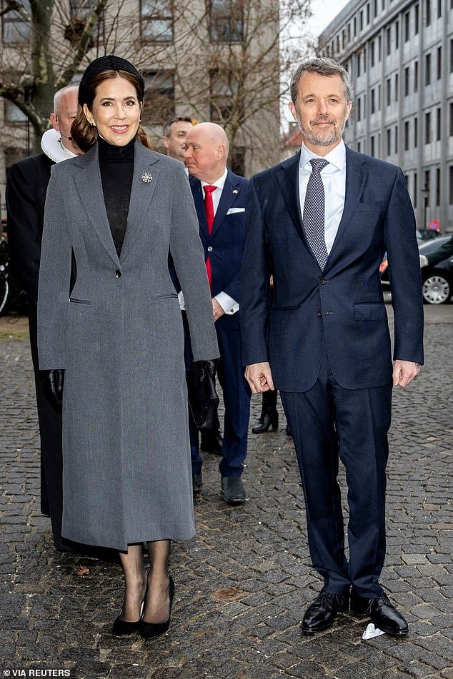 Queen Mary, Dinamarca, generalmente fue resbalada hoy con un abrigo gris formal porque participó en un servicio de la Iglesia de Copenhague en el tercer aniversario de la agresión de Ucrania junto con su esposo King Frederick X.