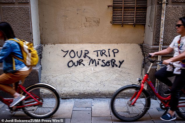 La palabra ‘turista de ir a casa’ se desplazó por primera vez en inglés en una pared debajo de una valla publicitaria de Nao Lavent cerca de Palma en abril pasado.