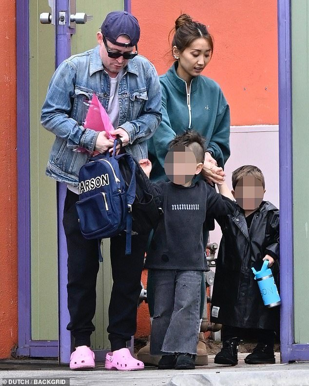 El ex actor hijo llevaba una chaqueta de mezclilla en una camiseta blanca y corredores negros. Puso un pie en rosa crok y llevaba un sombrero facturado en la espalda en su corto cabello rubio