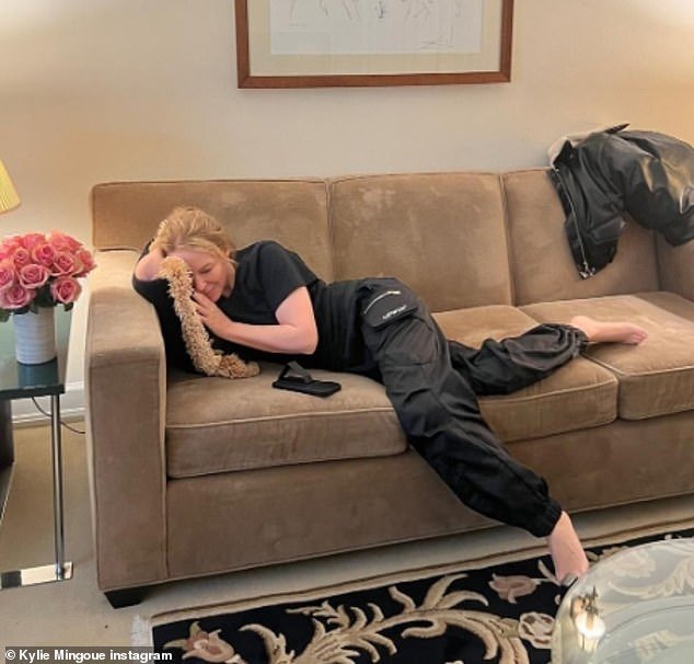 La reina del pop Kylie Minogue compartió una foto de ella descansando en el sofá de su habitación de hotel mientras vestía un chándal negro el miércoles.