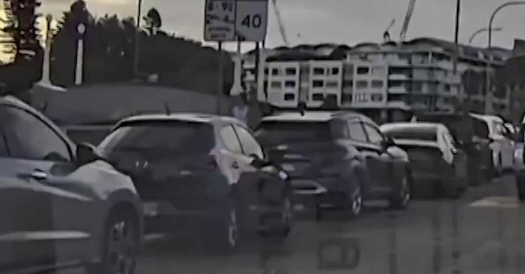 Los golosos estaban en Campbell Parade, una carretera cerca de Bondi Beach, cuando el presunto pistolero se detuvo en un automóvil plateado estacionado cerca de un puente peatonal que conducía a la playa. La pareja lo confrontó, según las imágenes de la cámara del tablero del momento que fueron capturadas por un automóvil que pasaba y verificadas por The New York Times.