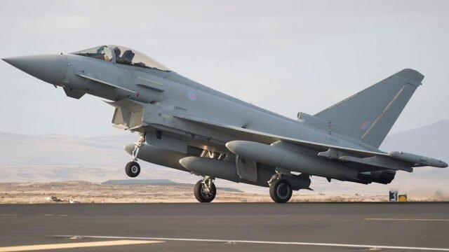 Un avión Typhoon aterriza en las Malvinas. La falta de Voyager probablemente significó que los RAF Typhoon no pudieran realizar patrullas aéreas las 24 horas del día durante el viaje de ida y vuelta de 1.600 millas a Georgia del Sur.