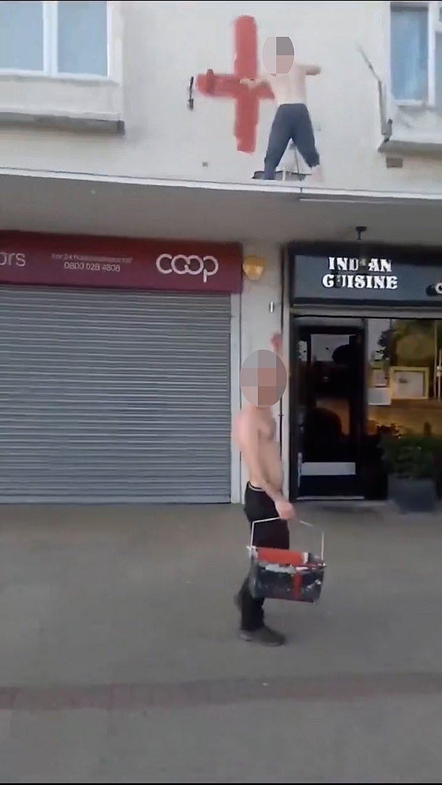 Las redes sociales han sido ampliamente circuladas por imágenes que dos hombres en topless pintaron en las paredes blancas del piso en una calle principal de Basildon en Essex y restaurantes en las paredes blancas del piso.