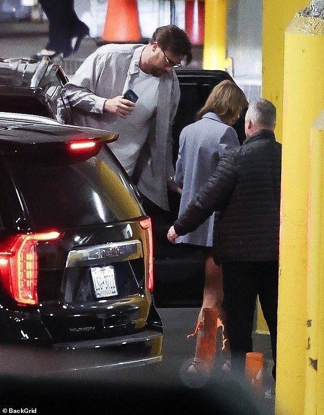 El Swift de 35 años mostró sus patas de tono en un aspecto informal de resbaladizo con un gran blazer gris en una pequeña falda.