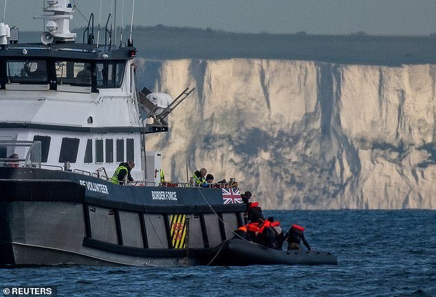 Un buque de la Fuerza Fronteriza Británica recoge un bote inflable que transporta inmigrantes frente a los Acantilados Blancos de Dover.