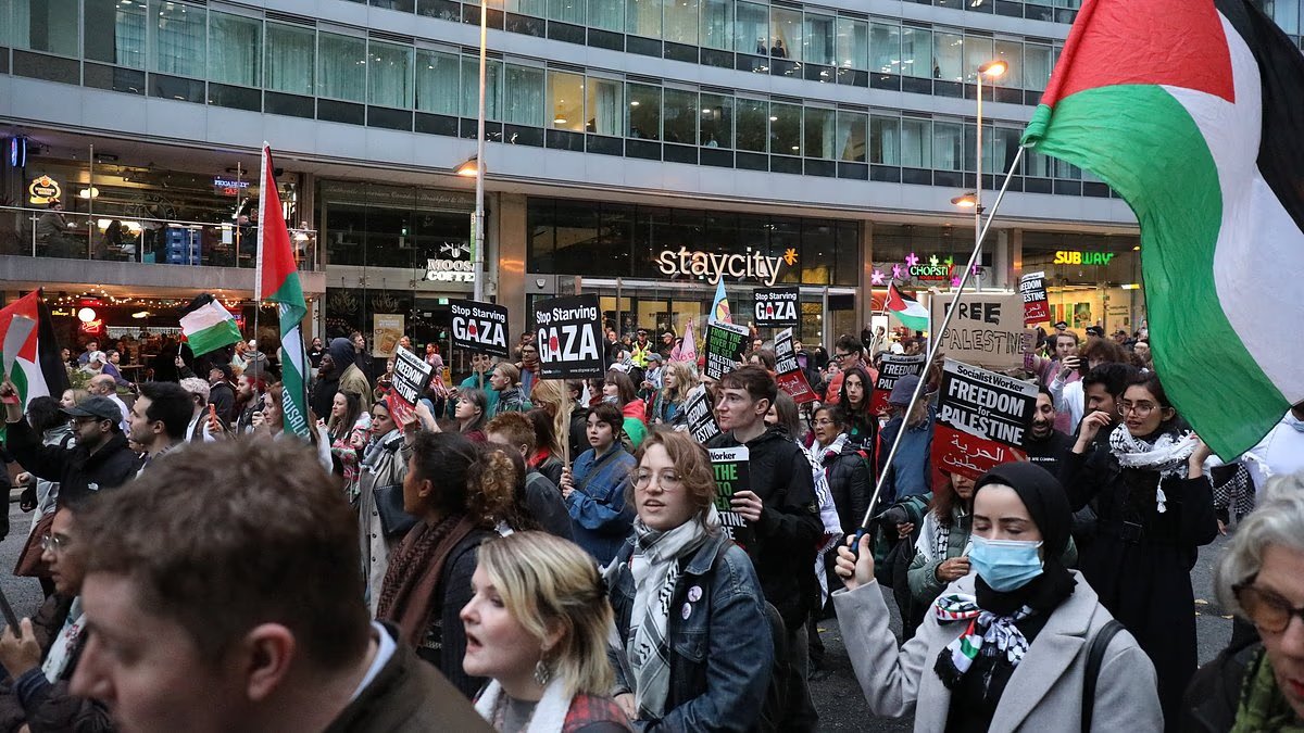 Palestinians ‘Pro March en el Manchester Center que un cuchillo mató a dos personas en una sinagoga de la ciudad