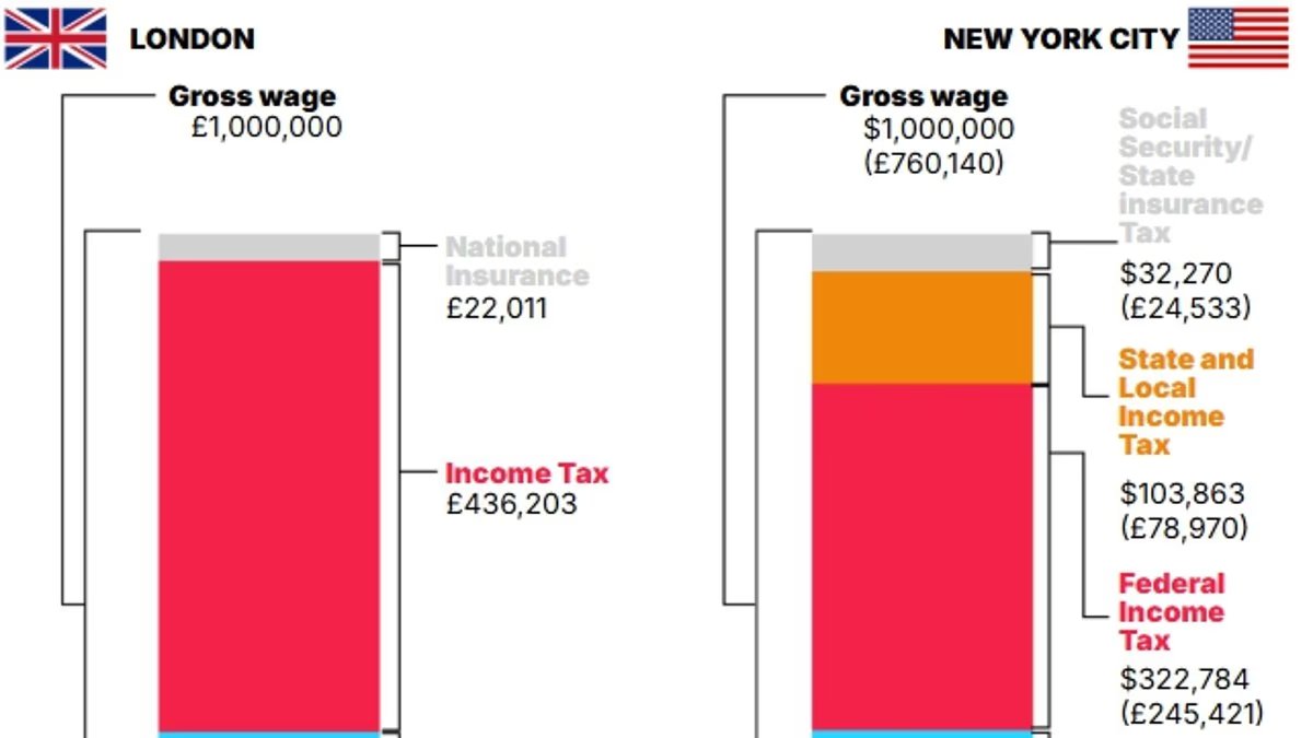 De hecho, un trabajador asalariado que gana 1.000.000 de libras se llevará a casa sólo 411.353 libras de su salario en Nueva York, frente a 541.786 libras en Londres, según cálculos del Daily Mail.