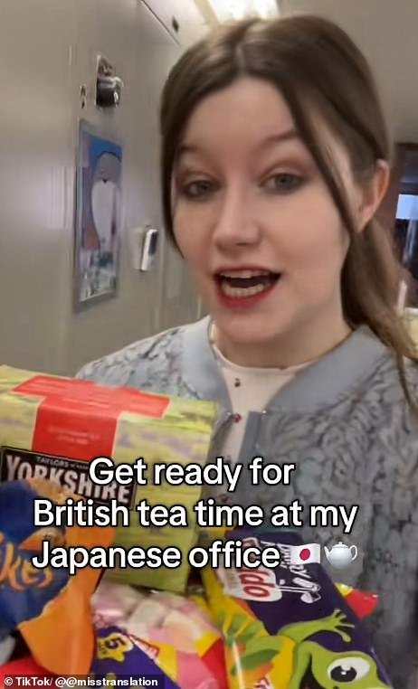 La trabajadora de boletos con base en Tokio, Carla (ilustrada) le dio a sus colegas japoneses para dar bocadillos británicos para probar por primera vez