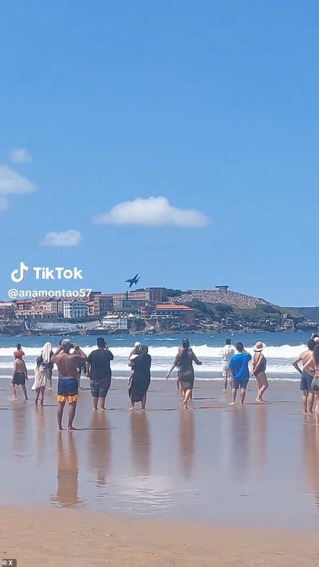 Este es el horrible momento en el que los turistas como avión de combate realizan un pase muy bajo en la playa llena de gente durante un aire en España.