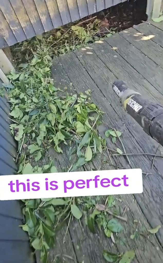 En el video se ve el jardín usando un soplador de hoja para soplar los recortes de seto debajo del panel de la cerca donde crece de él.