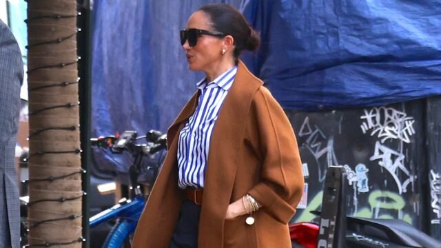 El miembro del club del Meatpacking District de la duquesa de Sussex Manhattan vestía una blusa a rayas y un abrigo marrón atado con un pantalón navi de pierna ancha.