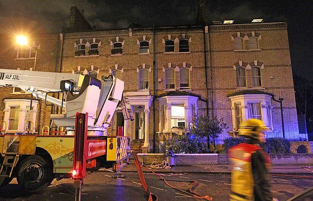 Los bomberos apagan el lugar del incendio en la casa de Daisy Goodwin en Londres.