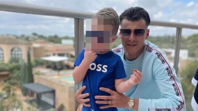 Blue Stevens con su hijo. Fue apuñalado el 9 de julio frente al Park Tower Hotel and Casino de 5 estrellas que cuesta £ 1,650 la noche, justo enfrente de los grandes almacenes Harvey Nichols en el centro de Londres.