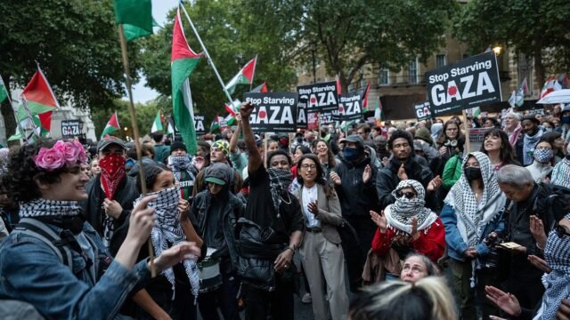 Como parte de la protesta contra el arresto de miembros de la flotilla global de Sumud, varios cientos de trabajadores se reunieron afuera de la puerta de Downing Street en Westminster ayer, incluida Greta Thunberg.