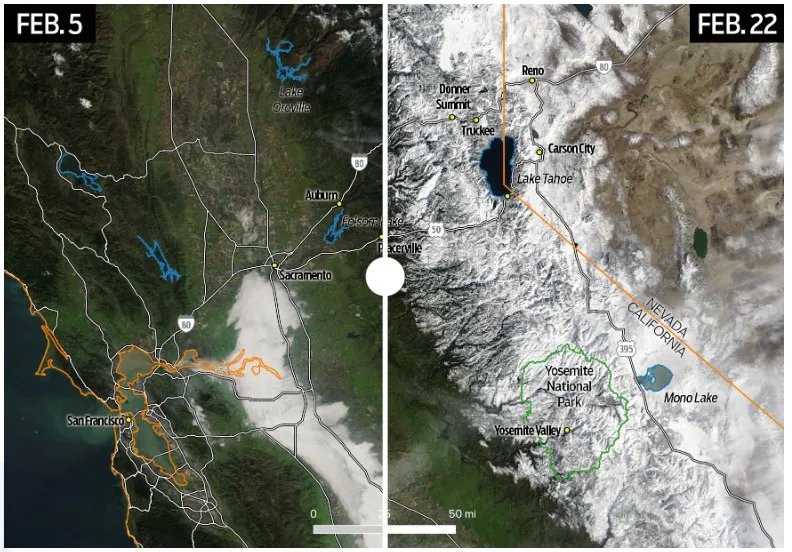 El 6 de enero, la capa de nieve en todo el estado de Sierra Nevada, que proporciona alrededor del 30% del suministro de agua de California, era el 93% de su promedio histórico. El 11 de febrero, había caído al 55%. El lunes subió al 73%, cuando quedaban de cuatro a seis semanas más de invierno.