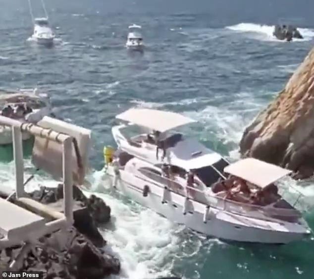 El barco blanco se estrelló contra una roca en las aguas de La Quebrada de Acapulco, mientras los turistas se apresuraban a saltar.