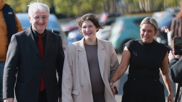 Se ve a una emotiva coolie sonriendo con su madre Leyane y su abogado Malkhaj Salakaia mientras abandona el Tribunal de la ciudad de Tbilisi como una mujer libre.