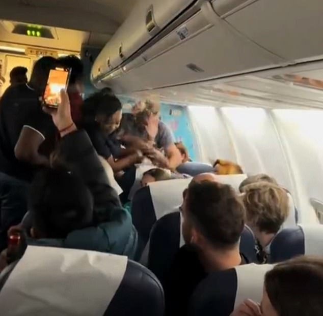 Se vio a los pasajeros tratando de empujar a la mujer hacia su asiento después de que ella la regañó dramáticamente.