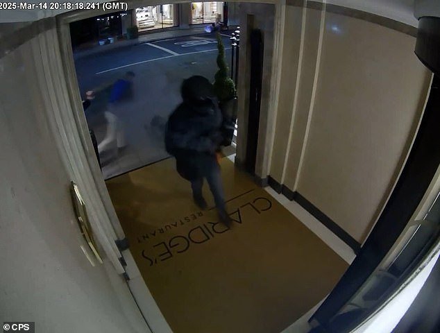 Usando un casco de motocicleta y Balaklava para concentrarse en su identidad, luego tomó un trineo en una caja de joyería, ya que las cámaras de CCTV del hotel estaban obsesionadas con una densa niebla negra.