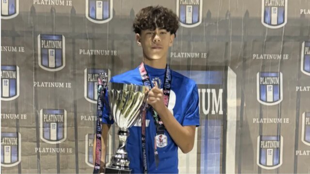 Adriel Enríquez, de 12 años, se desploma después de la práctica de fútbol vespertina del 26 de febrero en el Inland Empire Soccer Complex en Little League Drive en San Bernardino. Fue jugador del Platinum IE Soccer Club, con sede en San Bernardino.
