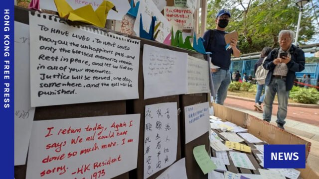 Los habitantes de Hong Kong presentan sus respetos a las víctimas del incendio de Tai Po en el tribunal Wang Fook en Tai Po el 2 de diciembre de 2025. Foto: Tom Grundy/HKFP
