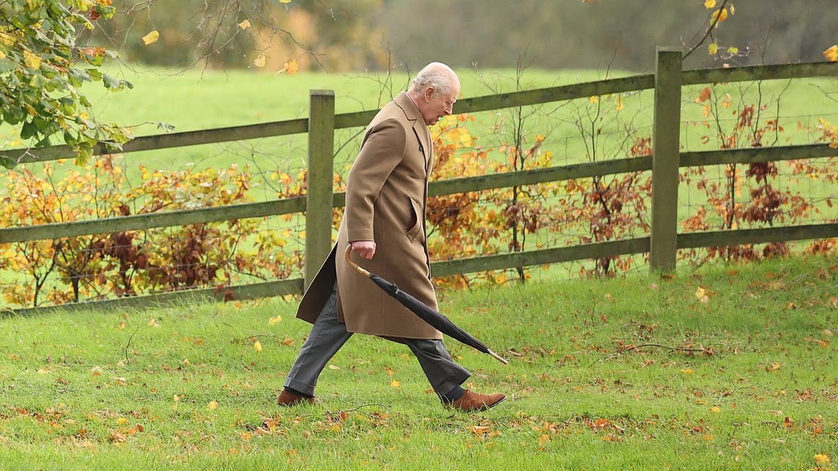 Las fotografías muestran al Rey caminando por verdes pastos con un largo abrigo beige de camino a la iglesia de Santa María Magdalena.