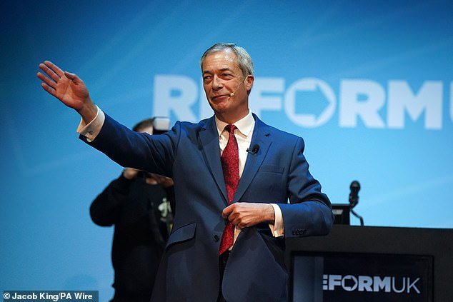 Farage aparece en la foto estrechando la mano de partidarios de la reforma del Reino Unido en la conferencia de East Midlands en Leicester.