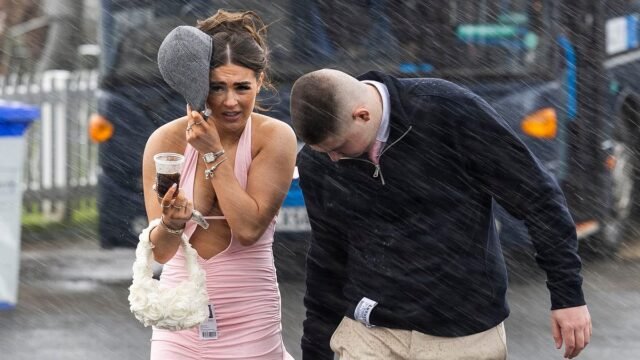 Los glamorosos asistentes a las carreras se vieron afectados por el clima lluvioso en The Corral Scottish Grand National en Ayrshire, Escocia.