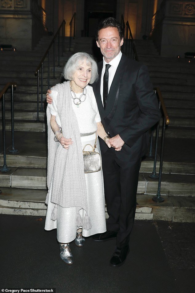 Cepillando la obra, Hugh (1,) caminó con el brazo con el artista de cerámica de 95 años Pat para ver a George Star adaptada a buenas noches en el Winter Garden Theatre de la ciudad de Nueva York.