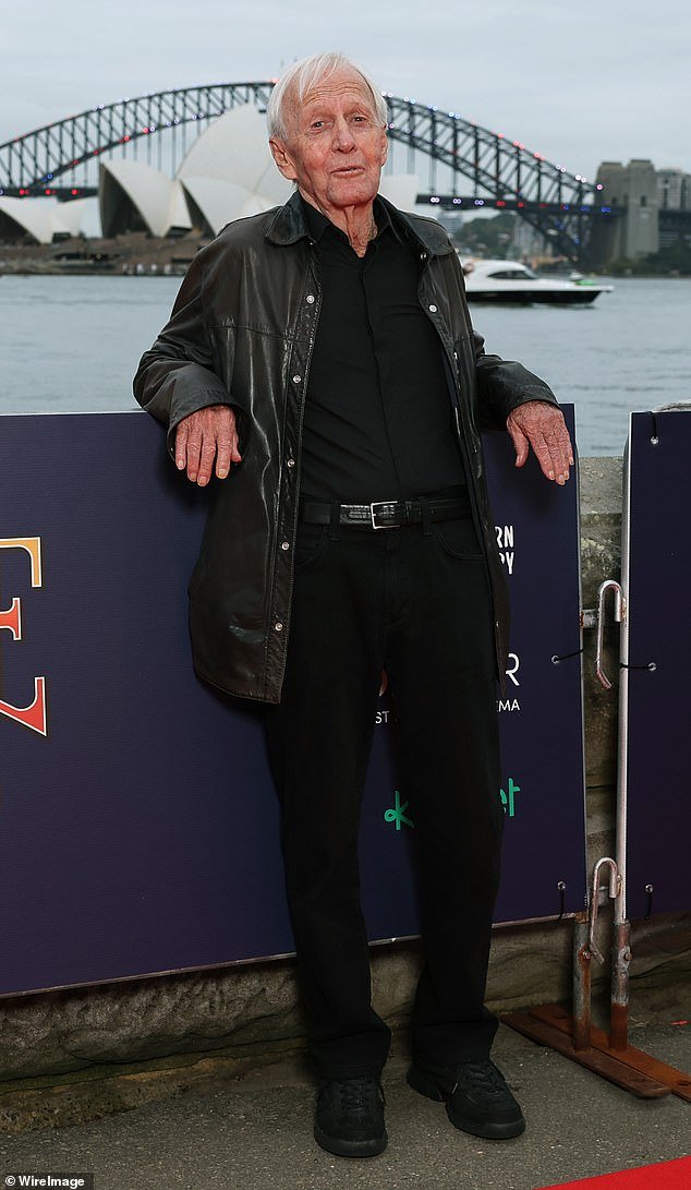 El actor australiano, de 85 años, lució un conjunto muy elegante para la ocasión, vistiendo una camisa negra con botones y una linda chaqueta de cuero marrón envejecido sobre jeans.