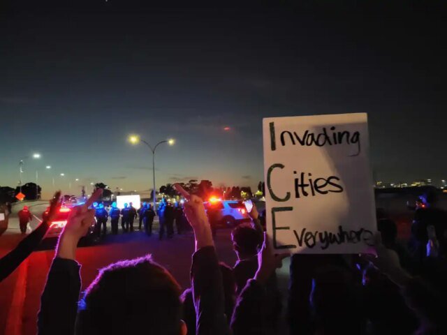 La entrada de la instalación militar al este de Oakland, que marca el único camino a la isla en automóvil o camión, se convirtió en el sitio de protestas el jueves cuando agentes federales llegaron al Área de la Bahía como parte de la siguiente fase de la represión migratoria del presidente Donald Trump. Más temprano ese mismo día, un grupo de agentes de Aduanas y Protección Fronteriza de Estados Unidos se abrieron paso entre una multitud de manifestantes antes del amanecer en la entrada de la isla, disparando un agente químico al menos a un manifestante en el proceso y obligando a la gente a apartarse del camino con sus vehículos.
