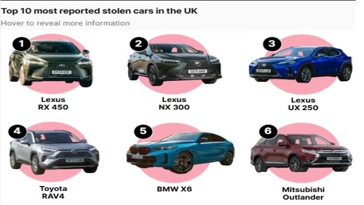 Muestra que el Lexus RX 450, que se vende por entre £65.000 y £85.000, es el modelo más robado en el país, con uno de cada 122 siendo blanco de ladrones en los seis meses hasta finales de junio.