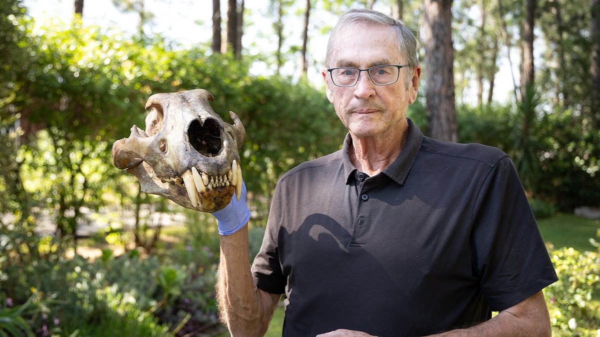 Foto: Lord Ashcroft sosteniendo el cráneo carbonizado de un león