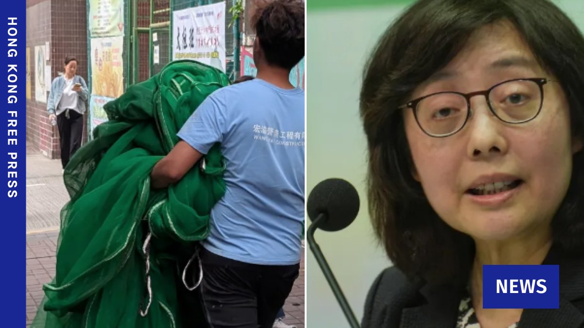 Un trabajador de la construcción transporta redes para andamios en Yau Ma Te el 2 de diciembre de 2025. Foto: Tom Grundy.Un trabajador de la construcción transporta redes para andamios en Yau Ma Te el 2 de diciembre de 2025. Foto: Tom Grundy.