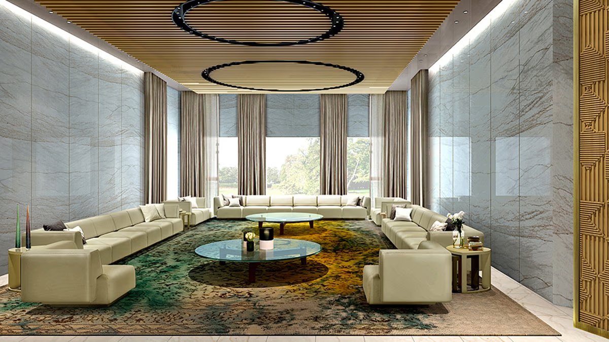 Los diseñadores dicen que la villa renovada tiene como objetivo combinar la grandeza clásica con un interior “juvenil y divertido”, modernizando la casa “estilo palacio” utilizando colores llamativos y acabados de mármol.